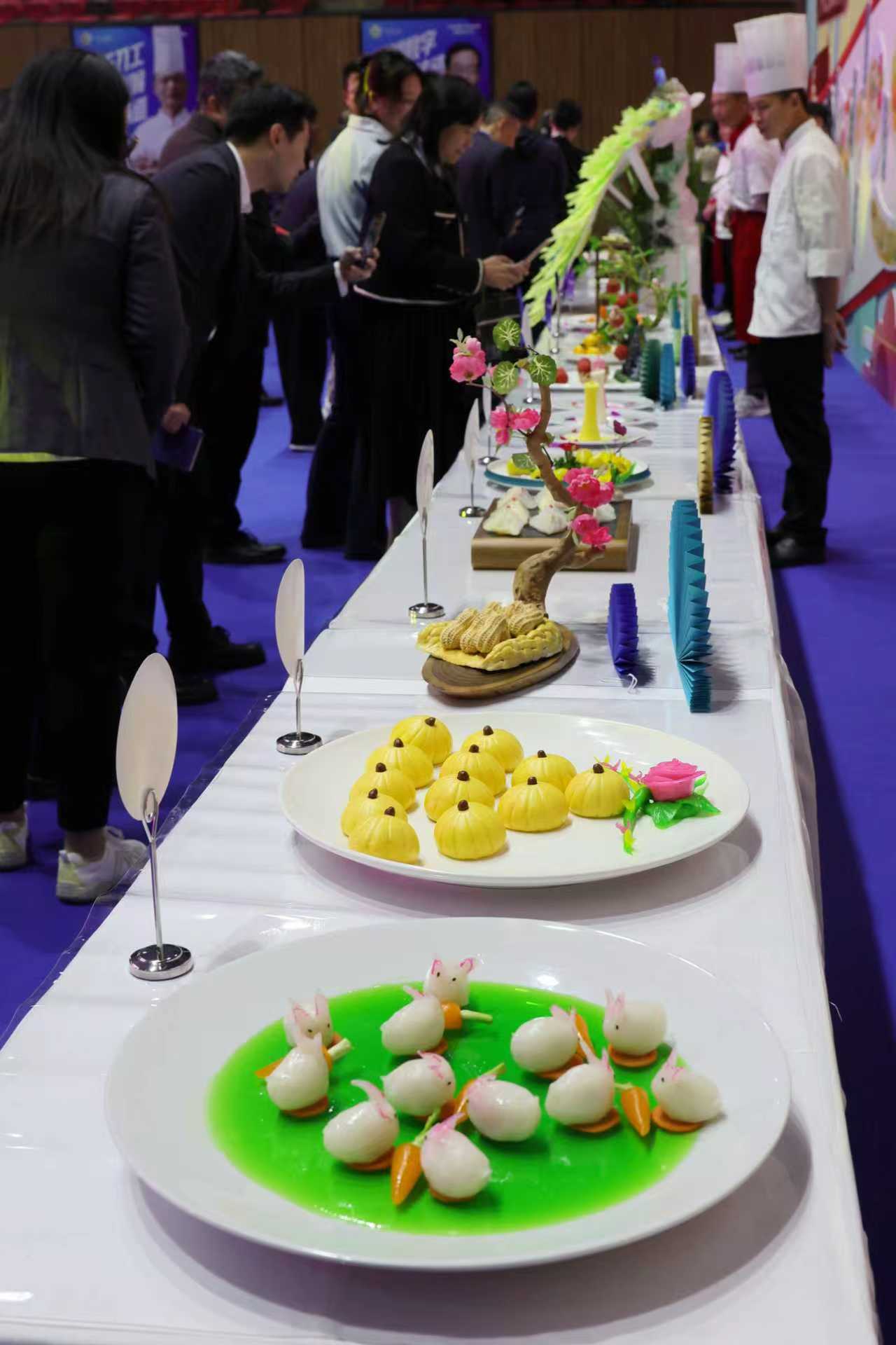 传统技艺同样“出圈”。中式烹调展区,《丰收礼赞黄金果》《匠心筑梦展鸿图》两道摆盘十分精美,金黄酥脆的外皮与鲜亮的酱色相映成趣;面点师傅捏出的“灵雀”“福鱼”惟妙惟肖,引得现场市民啧啧称奇。非遗香云纱展位前,传承人轻抚布料讲述工艺,电商直播区里主播正热情推介黄埔特色手作,形象设计互动区里化妆师现场演示“职场妆容”,连“拉面”“雕刻”等绝活表演都围满了人。“原来技能可以这么酷,又这么接地气!”一位带着孩子来参观的家长感慨。